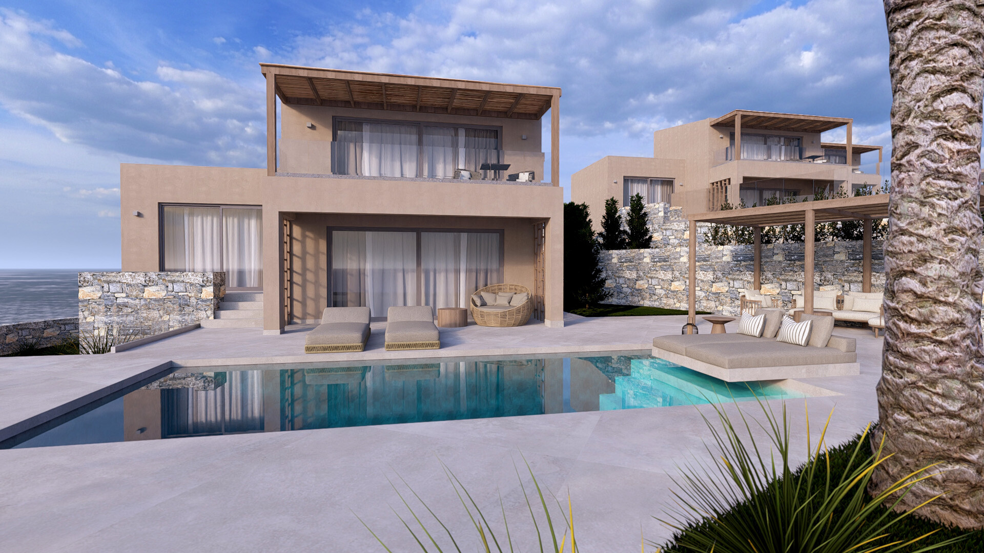 Die Anlage befindet sich auf einem ruhigen Hang mit freiem Blick auf das Kretische Meer. Die oberen Villen (A1–A3) bieten Panoramablick auf das Meer, während die unteren (A4–A6) nur wenige Schritte vom Strand entfernt liegen.